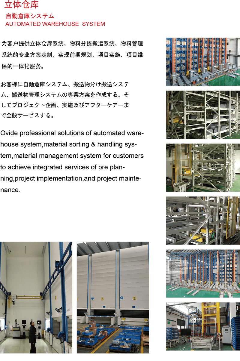 이 회사는 자동화 된 3 차원 창고 시스템, 재료 정렬 및 취급 시스템 및 재료 관리 시스템을위한 전문 솔루션을 제공하는 것을 전문으로합니다. 이러한 솔루션은 완전히 통합되어 설계 및 구현에서 지속적인 지원에 이르기까지 프로세스의 모든 단계가 다루어 지도록합니다. 고객의 요구에 대한 예리한 이해로 Wuxi Huiqian의 서비스는 사용자 정의 할 수 있으므로 각 시스템이 최적의 성능을 위해 맞춤화되도록합니다.