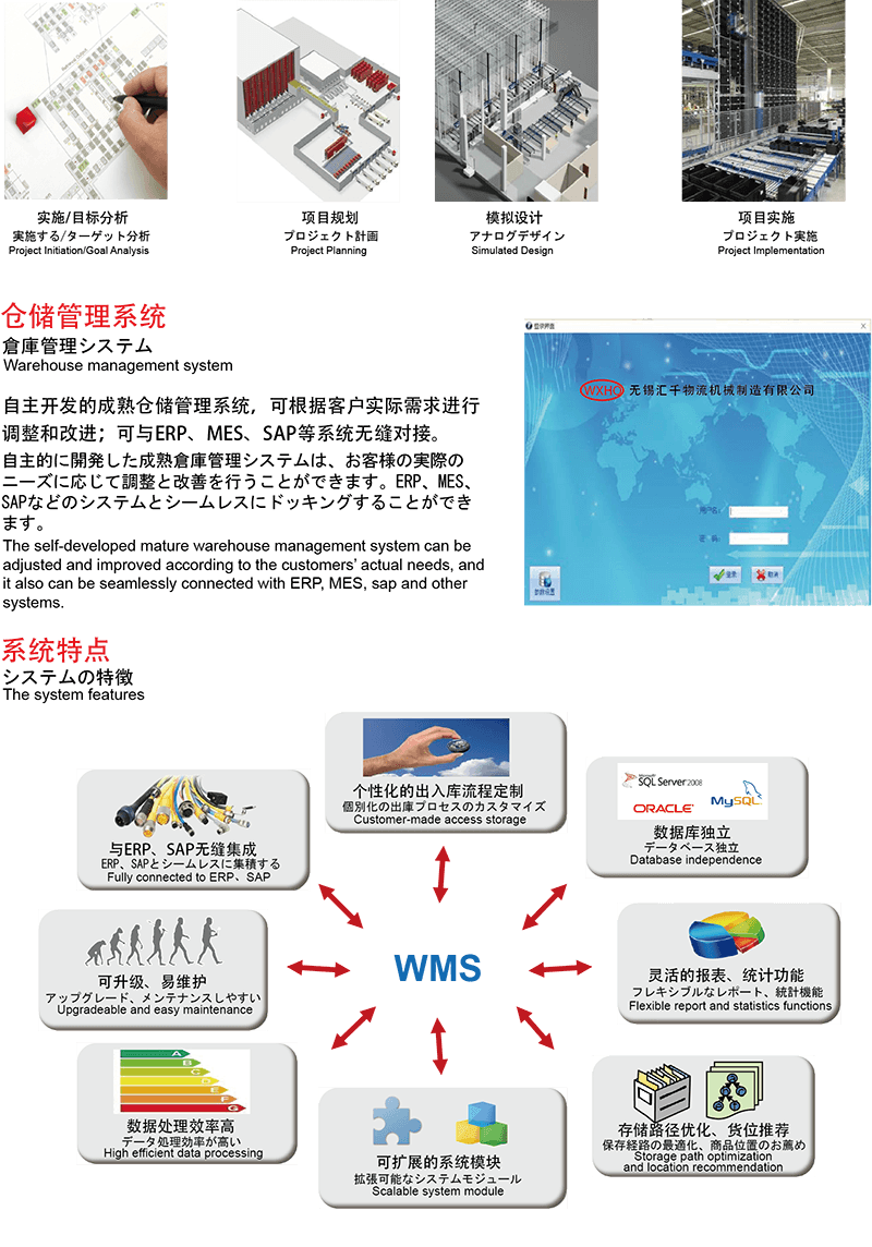 Wuxi Huiqian의 접근 방식의 중심은 각 고객의 특정 요구 사항을 충족하도록 사용자 정의 할 수있는 유연한 플랫폼 인 Advanced Warehouse Management System (WMS)입니다. 이 자체 개발 시스템은 ERP, MES, SAP 및 기타 비즈니스 관리 도구와 완벽하게 통합되어 실시간 추적, 재고 제어 및 향상된 데이터 가시성을 허용합니다. WMS는 In 및 Out 스토리지 관리, 시스템 유지 관리 및 데이터 쿼리 기능과 같은 모듈 식 기능을 제공함으로써 기본 창고 기능에서보다 복잡한 물류 작업에 이르기까지 모든 것을 관리하는 비즈니스를 지원합니다.