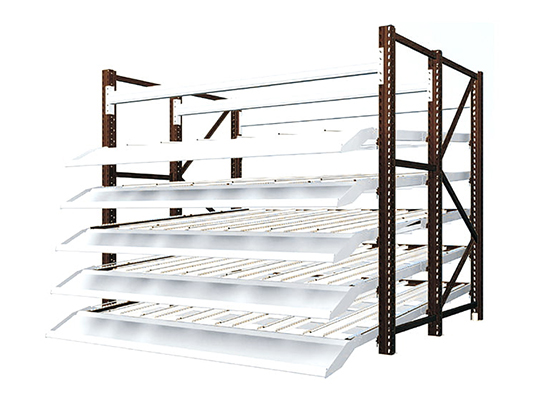 유창한 선반은 일반적으로 롤러 타입 알루미늄 합금 또는 중간 규모의 하중 선반의 판금 유창 막대를 사용하여 구성되며 유창한 막대는 약 3도에 배치됩니다. 유창한 선반으로 운반되는 상품은 일반적으로 종이로 포장되거나 내부의 플라스틱 회전 상자에 배치되며, 자체 무게를 사용하여 흐름을 달성하고 상품을 벗어나 저장 및 접근을 편리하게 만듭니다. 유창한 선반의 단위 하중 용량은 일반적으로 층당 약 100kg이며 선반 높이는 2.5 미터 이내입니다. 유창한 선반은 어셈블리 라인의 양쪽 측면, 어셈블리 라인 생산 및 유통 센터에서의 피킹 작업에 적합합니다. 상품의 정보 관리를 달성하기 위해 전자 태그가 장착 될 수 있습니다. 자동차, 제약, 화학 및 전자 제품과 같은 산업에서 널리 사용됩니다 .