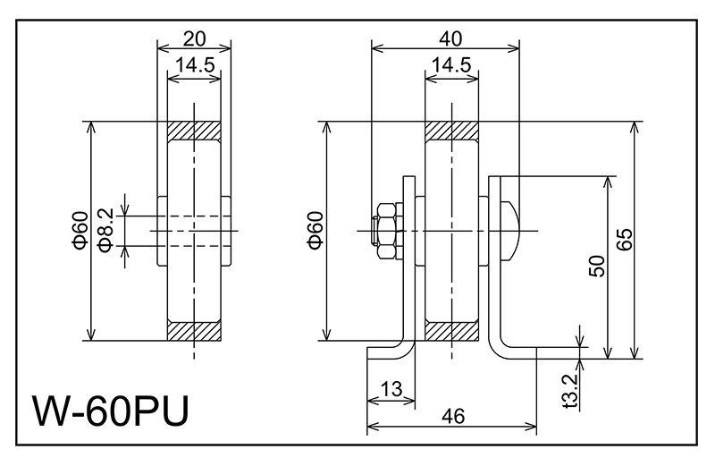 | W-60PU | 60x14.5x8.2x20 | M8X35L | 50x46x13x40x3.2 | 65 | 1800 · 2400 · 3000 | 75 · 100 · 150 · 200 | 50 | 기음 | PU |