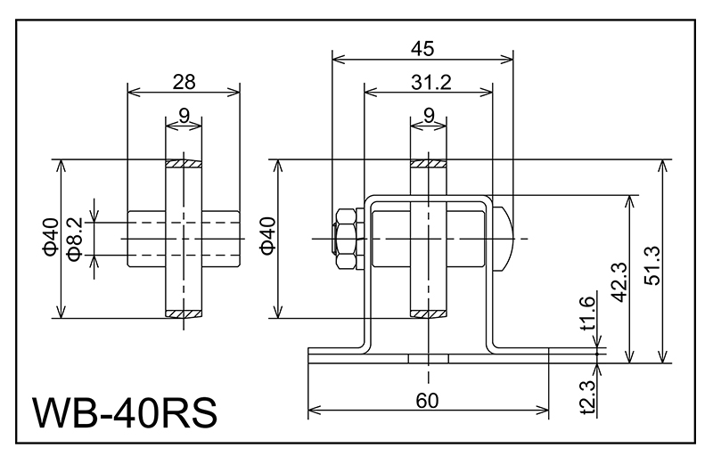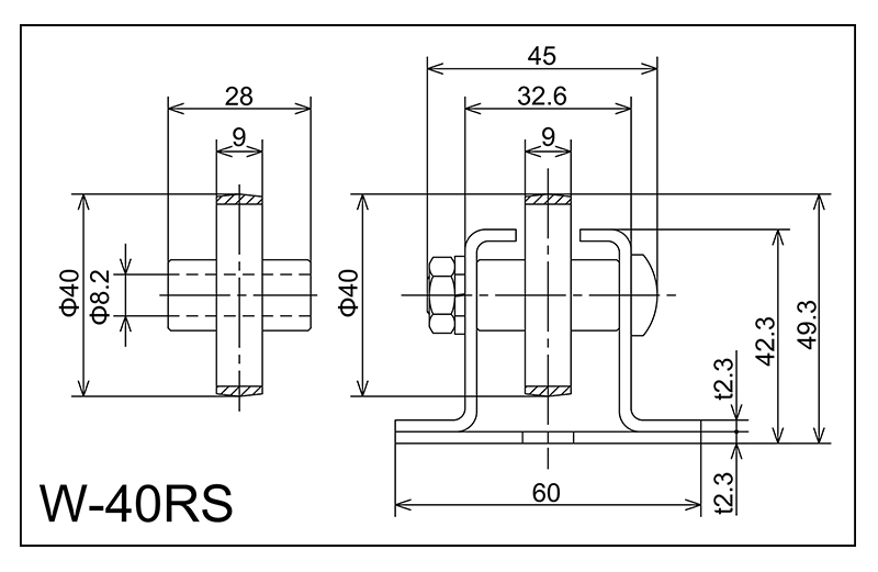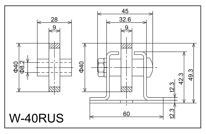 | W-40RUS | 40x9x8.2x28 | M8x40L | 42.3x60x32.6x45x2.3 | 49.3 | 1800 · 2400 · 3000 | 50 · 75 · 100 · 150 | 30 | J. | PU |
